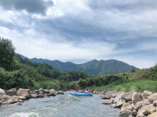 群山環(huán)抱,溪水清澈見(jiàn)底,漂流途中兩岸山林連綿起伏,郁郁蔥蔥,